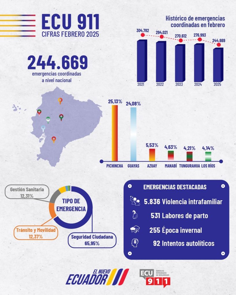 El Servicio Integrado de Seguridad ECU 911 reportó la coordinación de 244.669 emergencias en todo el país durante febrero de 2025. Esta cifra representa una reducción del 11,7 % en comparación con el mismo mes de 2024, cuando se registraron 276.993 casos.