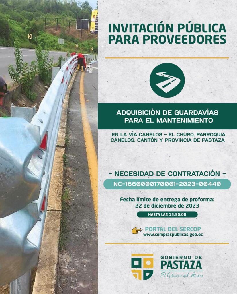 ➡️ ADQUISICIÓN DE GUARDAVÍAS PARA EL MANTENIMIENTO EN LA VÍA CANELOS – EL CHURO, PARROQUIA CANELOS, CANTÓN Y PROVINCIA DE PASTAZA