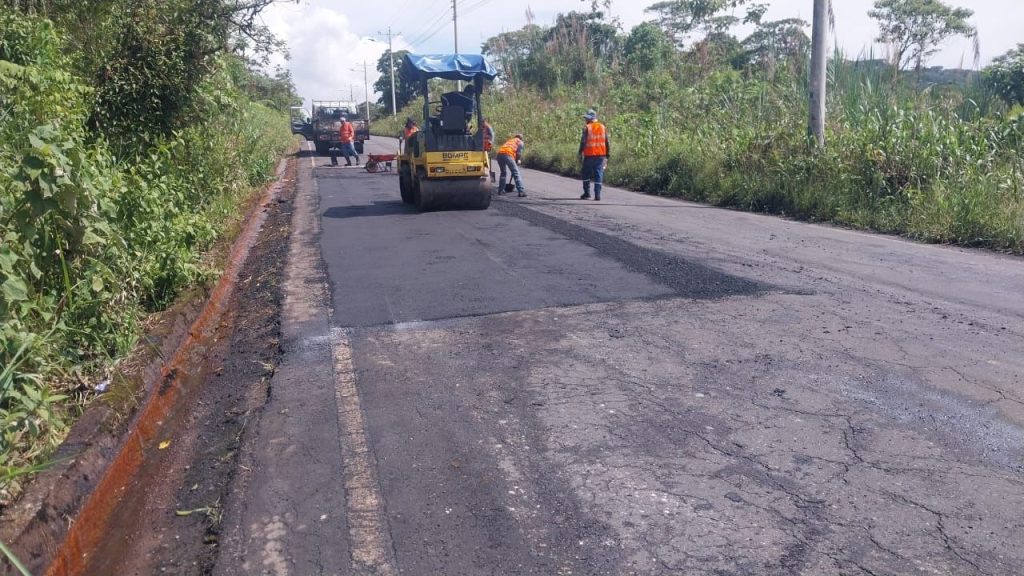 Gobierno de Pastaza ▶️ 1600 metros intervenidos con bacheo asfáltico entre Madre Tierra y Putuimi. Permanente trabajo vial. 🚜✅🤝