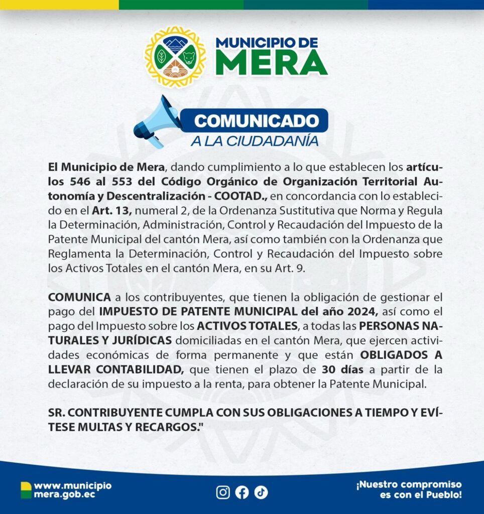 El Municipio de Mera informa a la ciudadanía el pago del Impuesto de Patente Municipal del año 2024, de acuerdo a lo que determina la Ley.