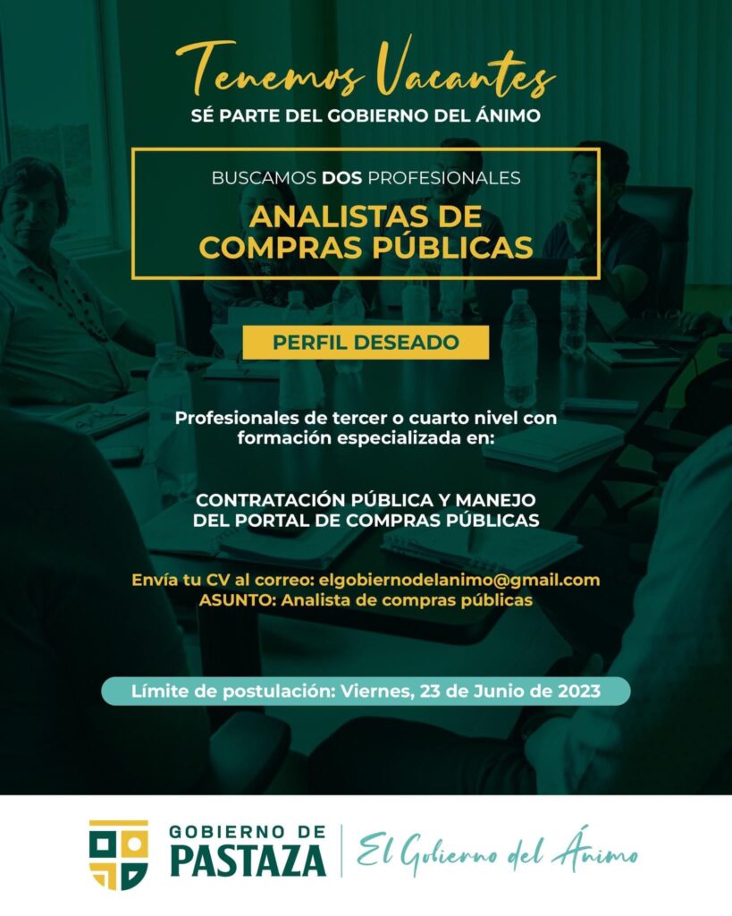 El Gobierno Provincial de Pastaza se encuentra en busca de dos talentosos Analistas de Compras Públicas para unirse a su equipo. Si eres una persona apasionada por el servicio público y deseas contribuir al desarrollo y bienestar de la comunidad, esta oportunidad puede ser ideal para ti.