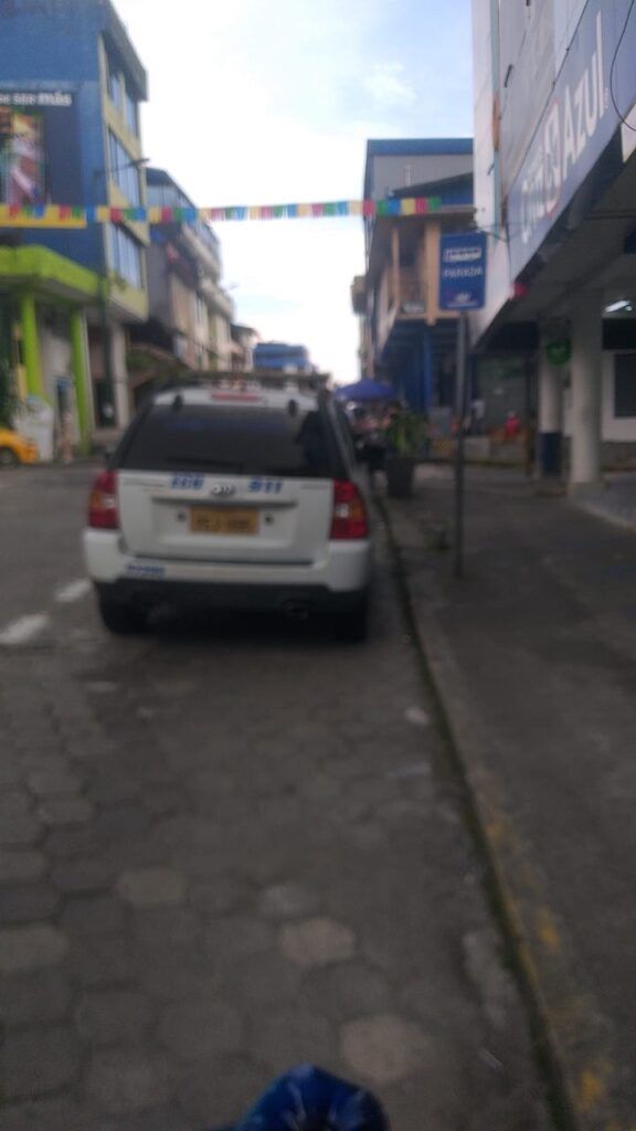 “Estimados amigos, el Eco-Amazónico, para que ustedes mismos se den cuenta, la misma autoridad en este caso, la Policía Nacional, está infringiendo la primera ley al interrumpir el tráfico y parquearse en zonas no permitidas. Observen este vehículo de la policía, que lleva 10 minutos parado con las placas PEJ1095.